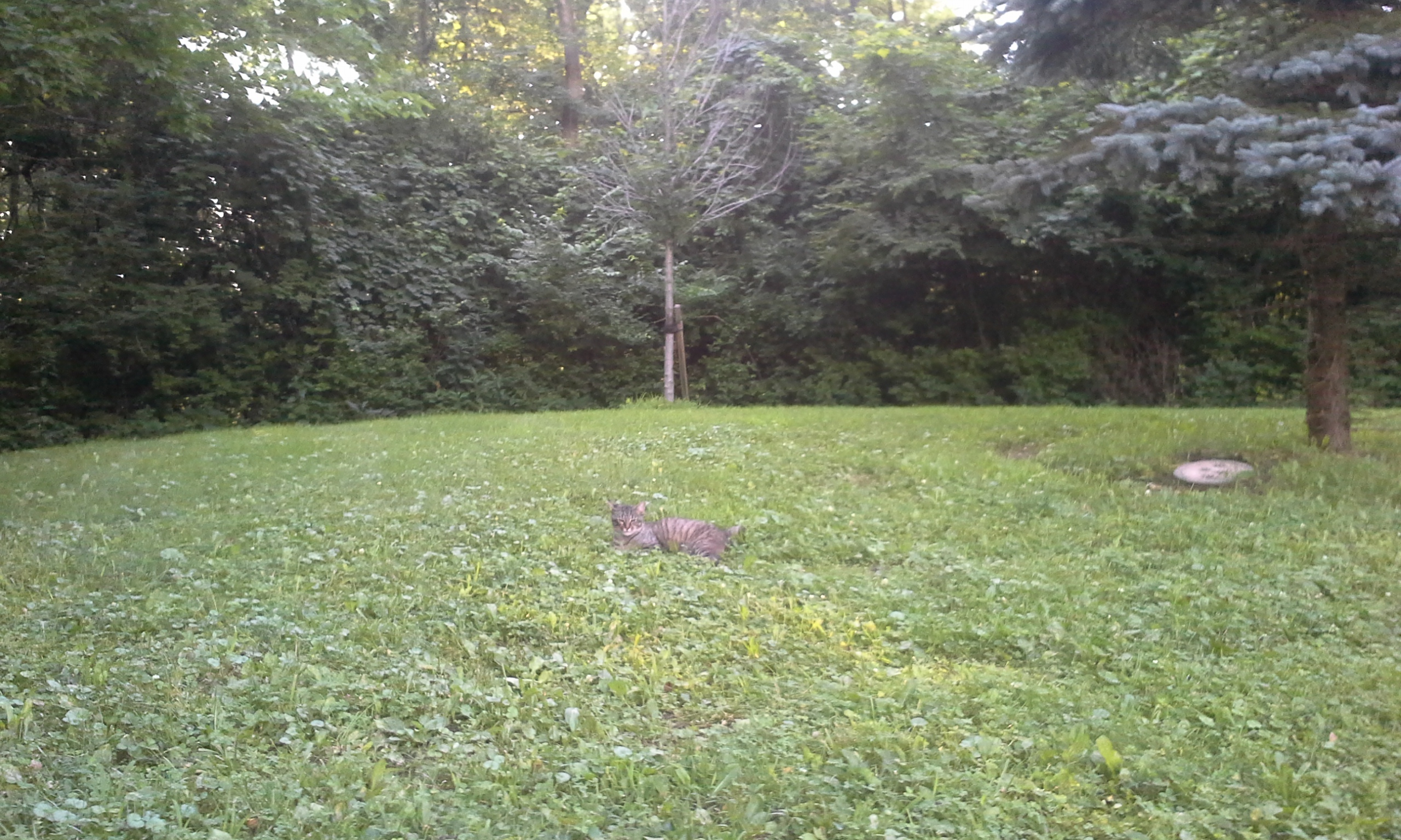 Since I’m far to the north and west of my current home in North Carolina, I’m disturbed by how light it is late in the day but this extra daylight gave me a chance to visit the grave of my maternal grandparents. Their ashes are interred at Quaker Hill, in a location marked only be a tree. When I visited tonight, three cats were hanging around, one of whom posed for me. I don’t know his name and, of course, he wouldn’t tell even if I’d asked.