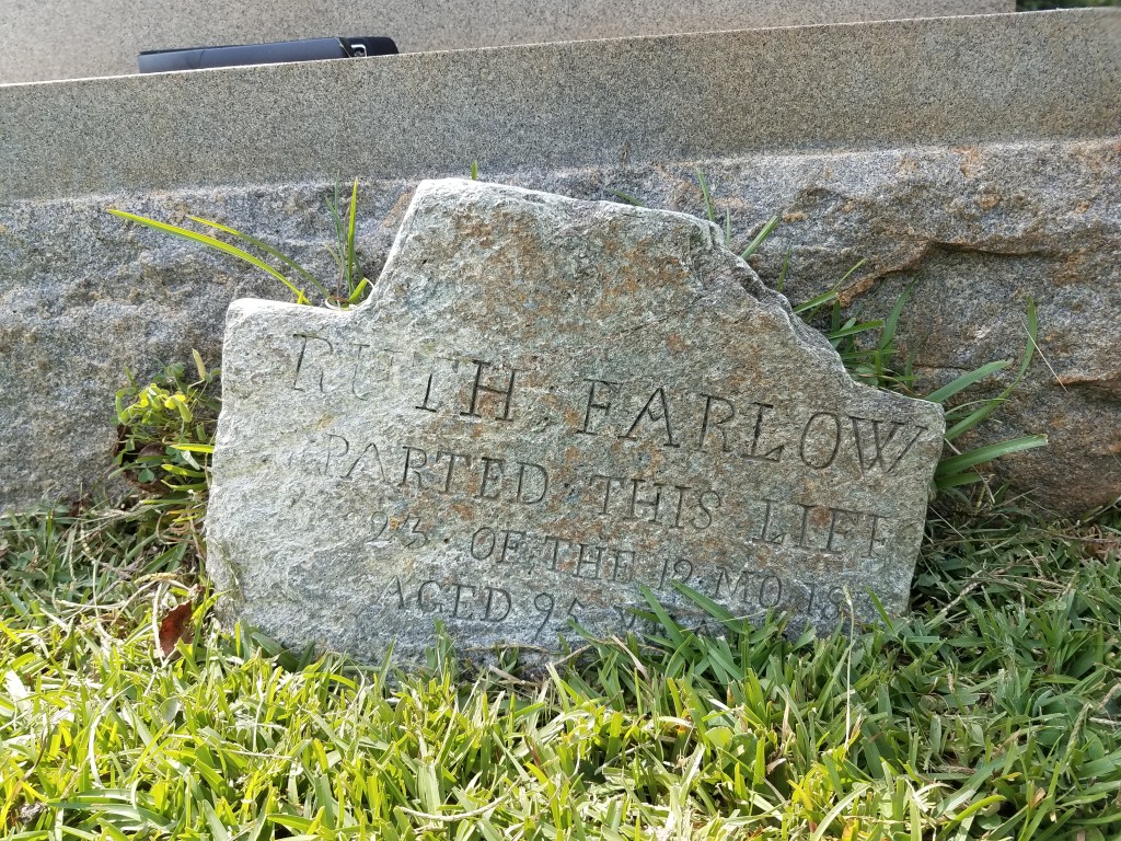 What I didn’t notice the last time I was there was a little half stone propped up against the base. As far as I can tell this looks like the original stone for my fifth-great grandmother Ruth Carter Farlow, John’s grandmother, who died on Christmas Eve 1837, just a month short of her 96th birthday and that was after having eleven kids over 20 years!