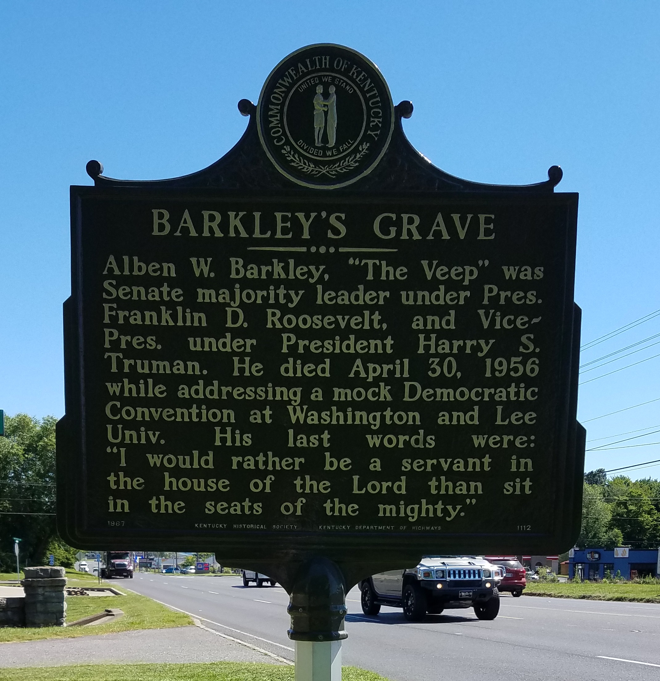 My mission was to add Alben Barkley to my Dead Vice Presidents collection. I kept my car windows up for fuel efficiency even though the temperatures were nice and cool and when I opened my door at Mount Kenton Cemetery, my face was caressed by the smell of freshly mown grass but with an extra timbre. I’m guessing it was bluegrass since this is Kentucky.