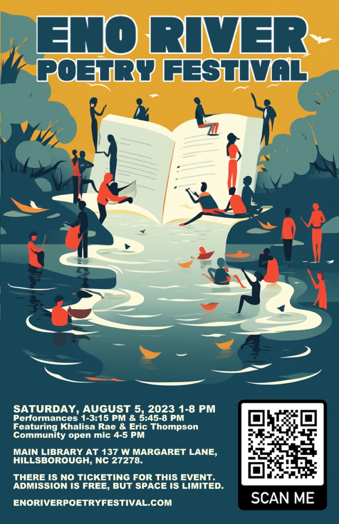 On Saturday, August 5th, at the Main Branch of the Orange County Library in charming downtown Hillsborough, NC, I’ll be participating in the first ever Eno River Poetry Festival. It starts at 1pm and I’ll be performing in that afternoon session. Then between 4pm and 5pm there’ll be an open mic for anybody to share their work followed by an evening session starting at 5:45pm, featuring Khalisa Rae and Eric Thompson.