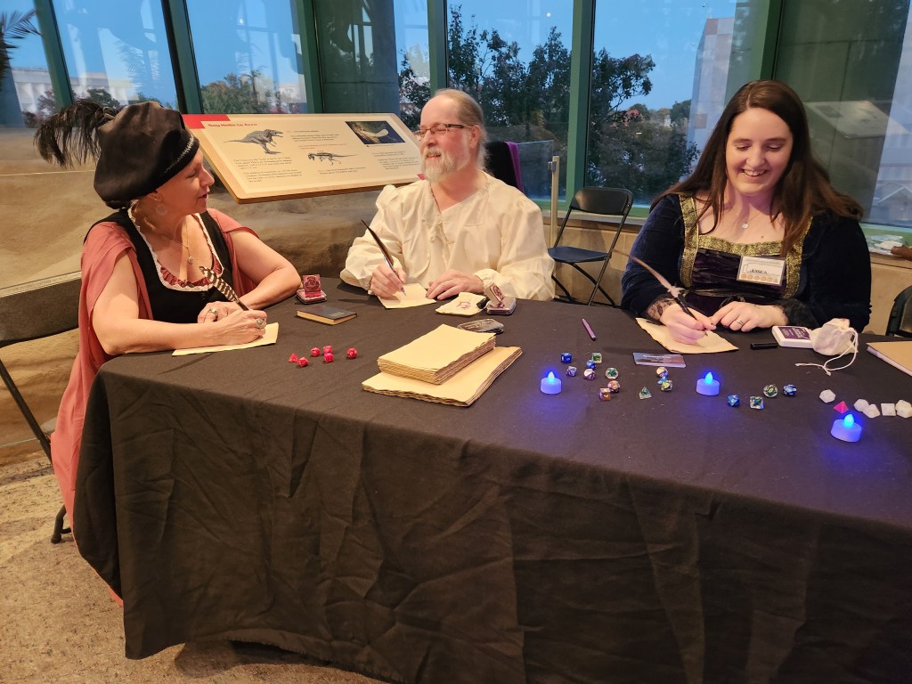 Last Friday, I spent my evening writing poetry for a bunch of Dungeons & Dragons nerds. The NC Museum of Natural Sciences held an event called Magic & Monsters and they invited Living Poetry to participate, so Anna Weaver, Jessica Covil-Manset and I got all dressed up and spent three hours writing for our fellow geeks beneath the threatening gaze of a skeletal Acrocanthosaurs.